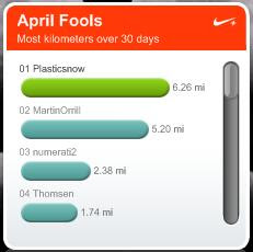 One of the challenges I’ve signed up for is a beginners most mileage in April, and by some freak occurrence I actually happen to be in the lead! Check out the current standings!